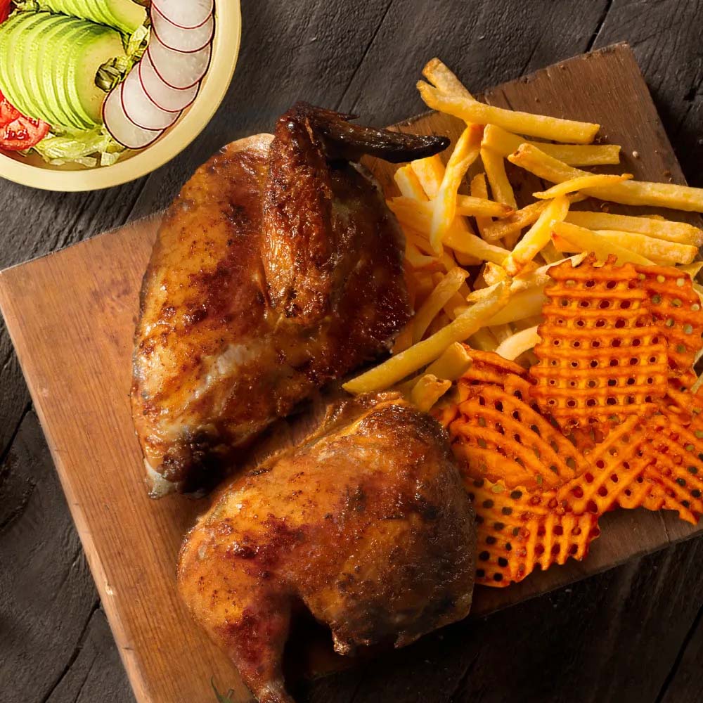 1/2 Pardos Brasa con una porción de papas fritas personal y guarnición de ensalada Pardos