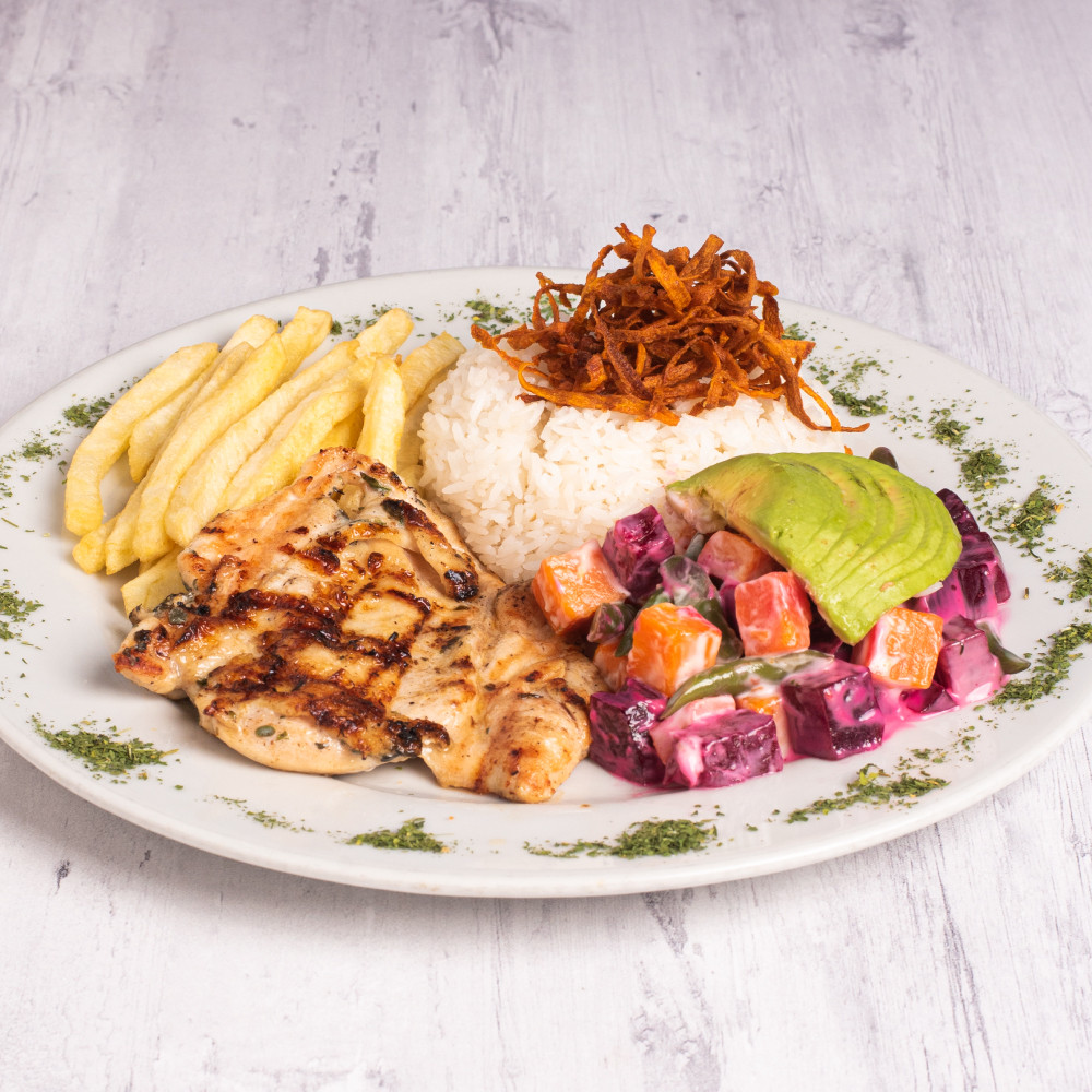 1/2 Parrillero Original con arroz , papas fritas y ensalada rusa apaltada. Este producto inc... Ver más