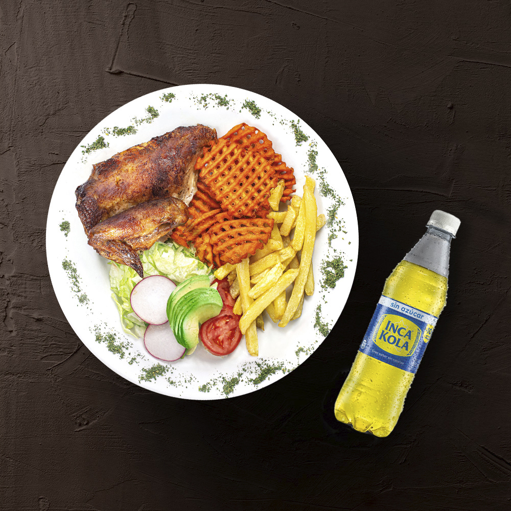 1 Pardos Brasa + papas fritas + guarnición + Inca Kola sin azúcar de 2.25 LT. Esta Promoci... Ver más